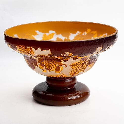 Fructiera tip Galle realizată în totalitate manual în atelierele noastre din Romania. Are la bază tehnica originală a lui Emile Galle, sticla cameo sau cameoglass care înseamnă sticla stratificată și prelucrată în mai multe etape. Decorul vazei este realizat printr-o pictură cu un lac special iar apoi introdusă in mai multe băi de acid pentru a îndepărta straturile de culoare și a păstra decorul cu ajutorul lacului. Fiecare produs este unic el fiind lucrat în totalitate manual.